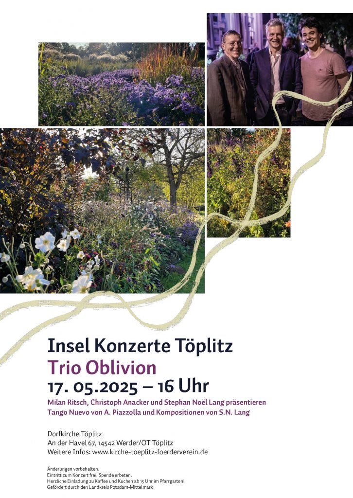 Es ist uns ein Bedürfnis, euch für den wunderbaren wie auch so kurzweiligen Konzertabend zu danken! Die drei Musiker als eingespieltes Konzerttrio erleben zu können, war grandios. Über einen gemeinsamen Freund konntet ihr den Kontakt zu Milan Ritsch herstellen, der bereits 2024 sehr gern dazu bereit war, in der Töplitzer Dorfkirche aufzutreten. Er selbst und sein Kollege am Kontrabass, Christoph Anacker, sind hauptberuflich bei der Staatskapelle in der Staatsoper Unter den Linden tätig. Mit dem großartigen Jazzpianisten und Arrangieur Stephan Lang sind sie als Trio Oblivion unschlagbar. Ja und die Töplitzer Kirche bietet sowieso die perfekte Klangkulisse.